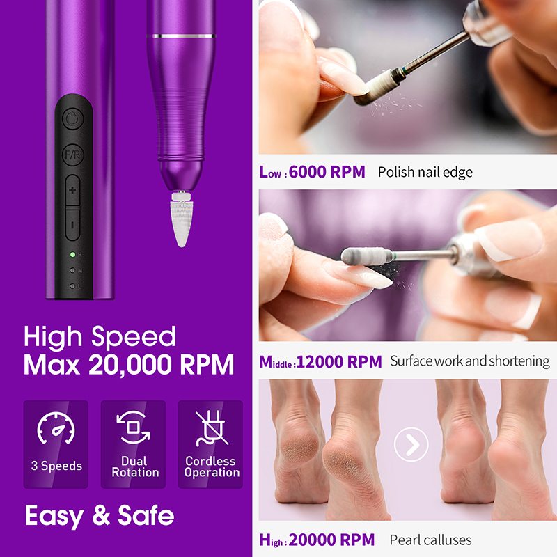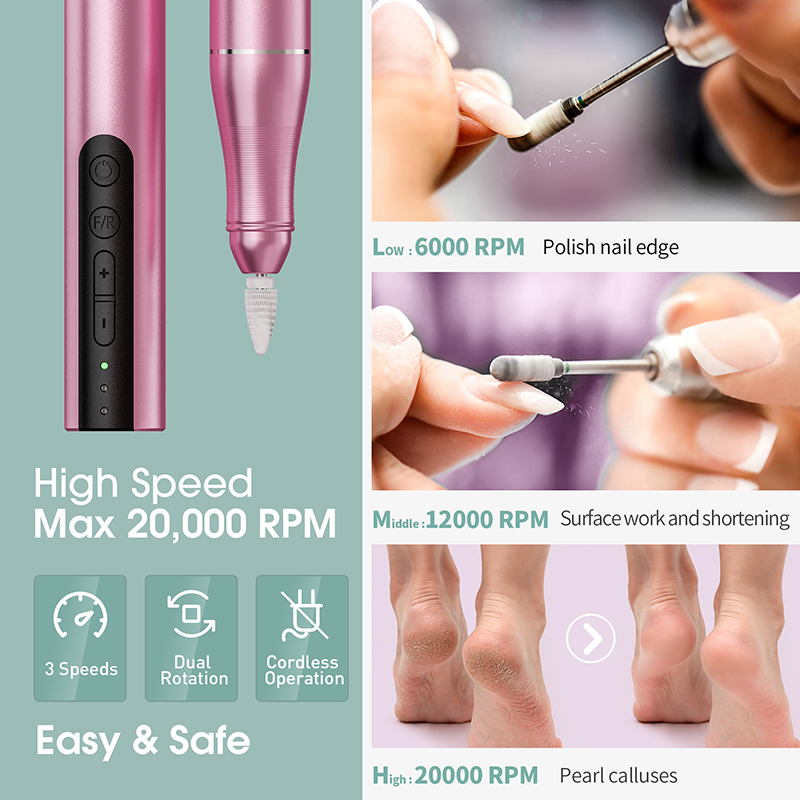 Le lime per unghie professionali sono progettate con 3 velocità di 6000-12000-20000, basta premere brevemente il pulsante + o - per aumentare o diminuire la velocità. Facile regolare la velocità e risparmiare tempo durante l'affilatura delle unghie. La direzione del trapano può essere facilmente cambiata premendo il pulsante F/R, ideale per mancini, esperti nail artist o principianti nella cura delle unghie.
