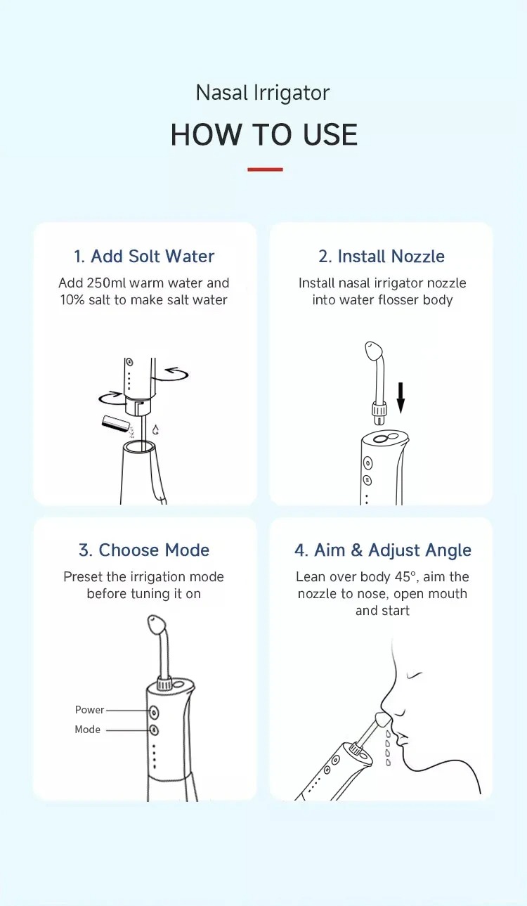 Irrigazione nasale efficiente: gli irrigatori nasali elettrici offrono un'irrigazione efficiente e completa dei passaggi nasali, aiutando a eliminare muco, allergeni e detriti in modo più efficace rispetto ai metodi manuali. Convenienza: con il loro funzionamento elettrico e le impostazioni regolabili, gli irrigatori nasali elettrici forniscono una soluzione conveniente per l'irrigazione nasale, risparmiando tempo e fatica agli utenti rispetto alle tecniche di irrigazione manuale. Personalizzazione: le impostazioni regolabili degli irrigatori nasali elettrici consentono agli utenti di personalizzare la propria esperienza di irrigazione in base alle proprie esigenze, preferenze e livelli di comfort individuali.