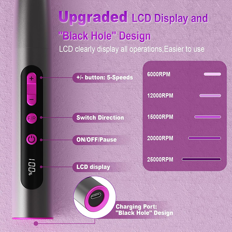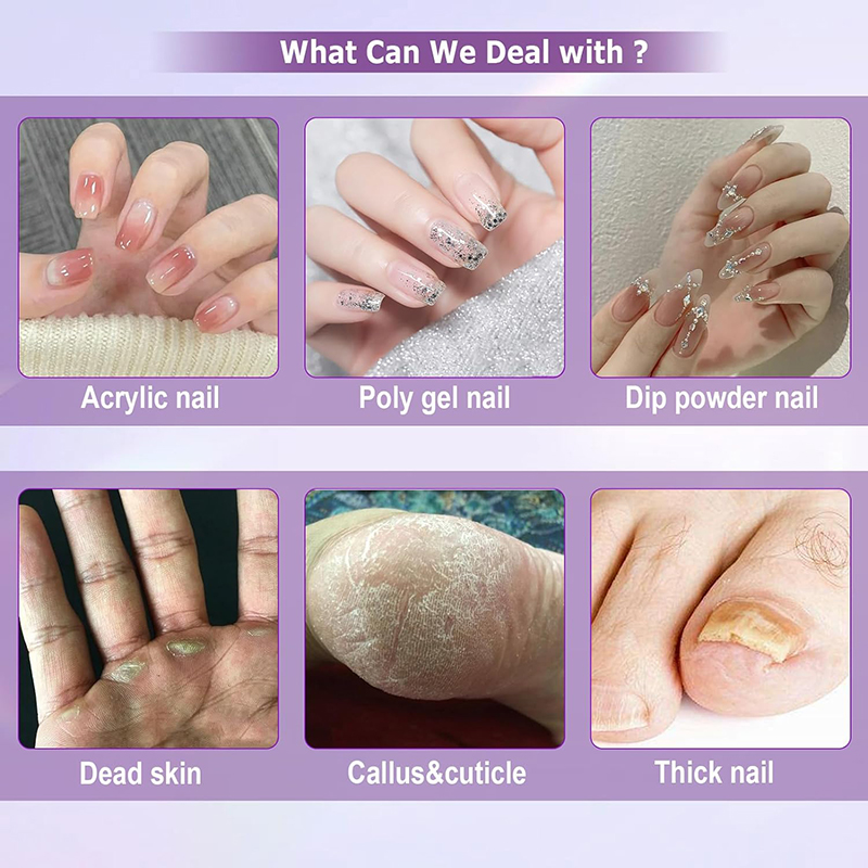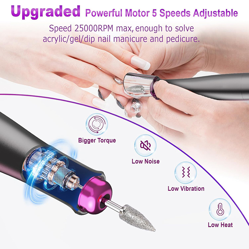 Trapano elettrico per unghie Il potente motore aggiornato è perfetto per tutte le tue esigenze di manicure e pedicure, inclusa la rimozione di unghie acriliche, unghie in gel poli, gel di scarabei, unghie in polvere, cuticole, pelle morta, calli e unghie spesse.