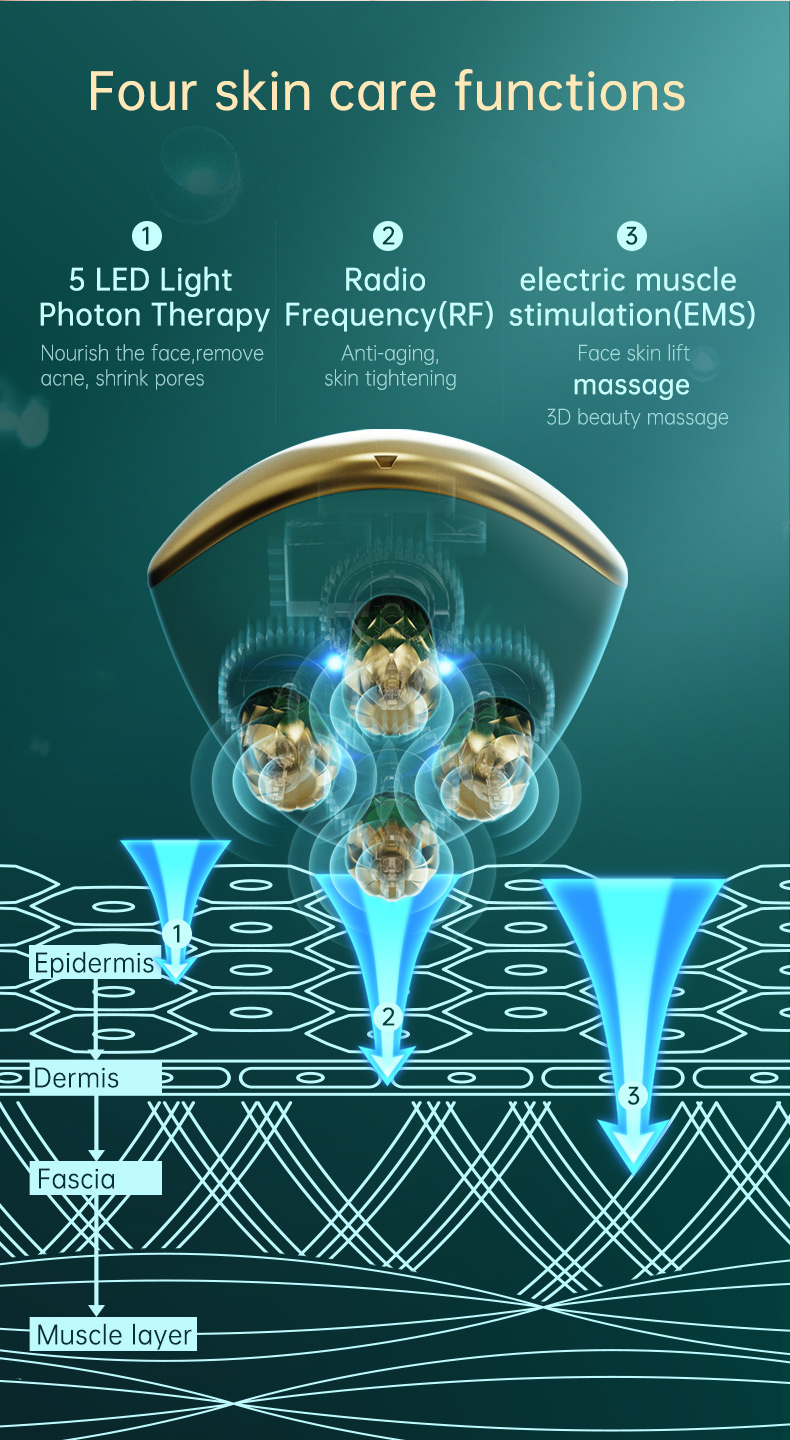 QUALI SONO I VANTAGGI? -- La macchina di bellezza è un dispositivo antietà multifunzionale che include la tecnologia a radiofrequenza (RF) con terapia della luce rossa/blu, EMS per ridurre linee e rughe, migliorare la penetrazione della pelle e le capacità di assorbimento, ecc.
