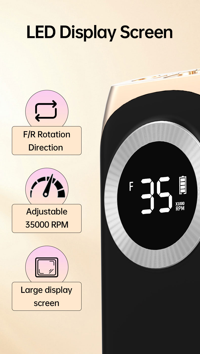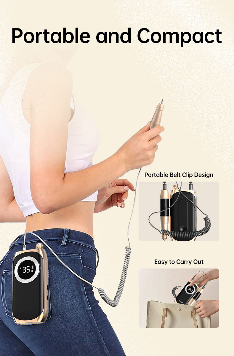 Rechargeable and Cordless: With a large battery capacity(2500mA), you can use this nail drill at anywhere anytime. Being fully charged for about 4 hours, the electric nail file will work up to 10 hours. The smart LCD screen will display the precious RPM and electricity. A Belt clip of the body case allows you to hang it on your belt on the waist and it is compact enough(6.08*2.94*0.98) to pack into your traveling bag or case.